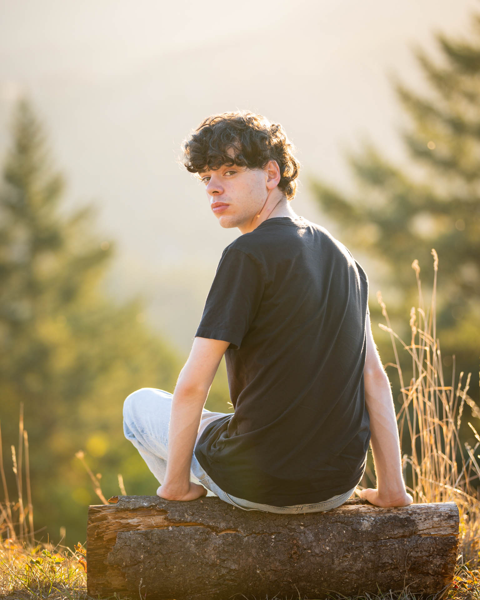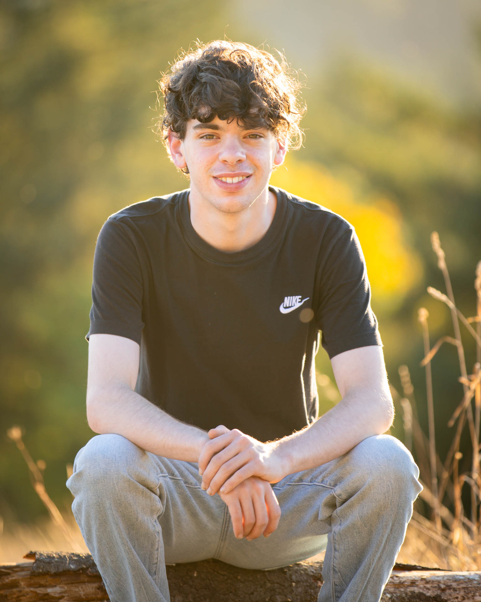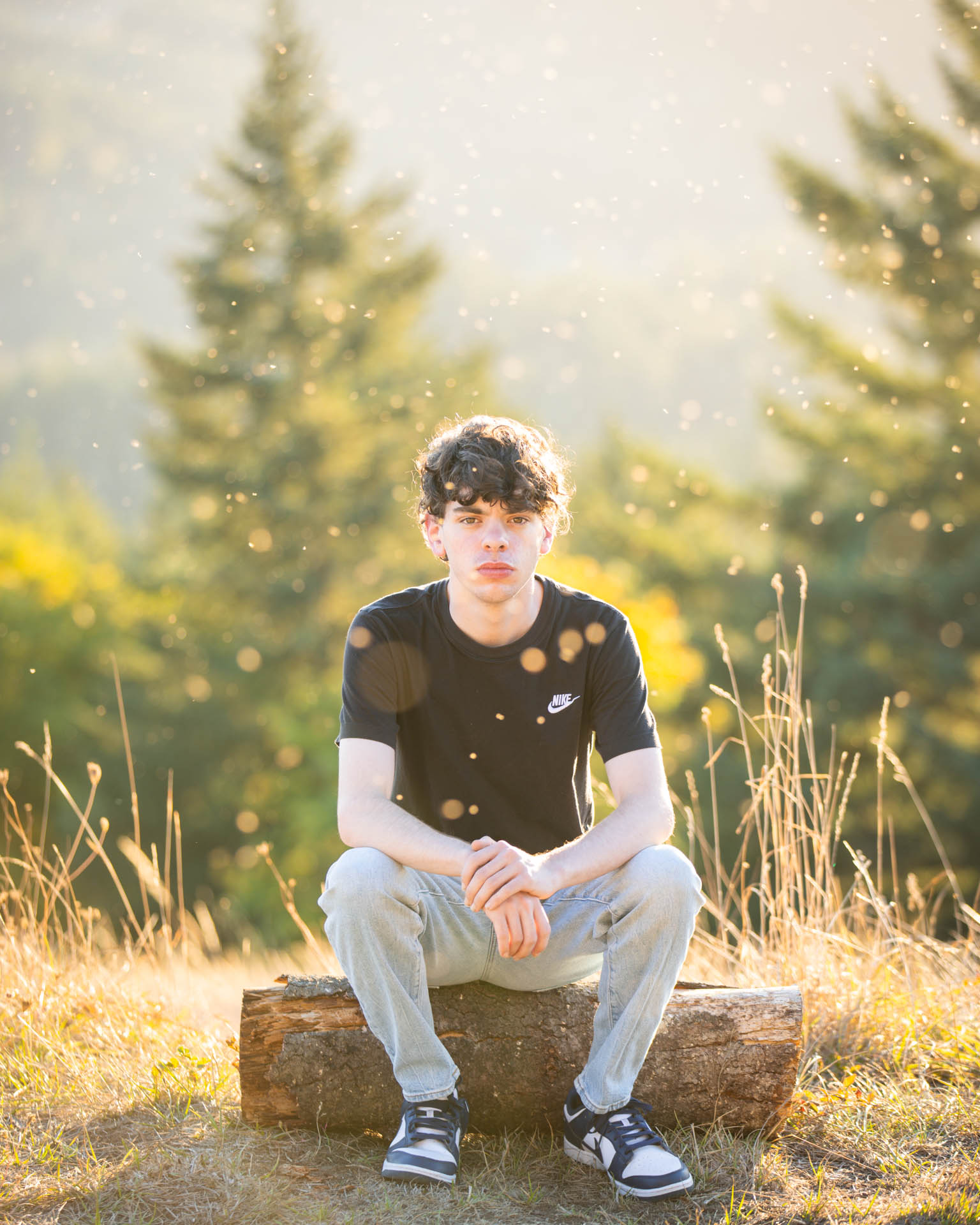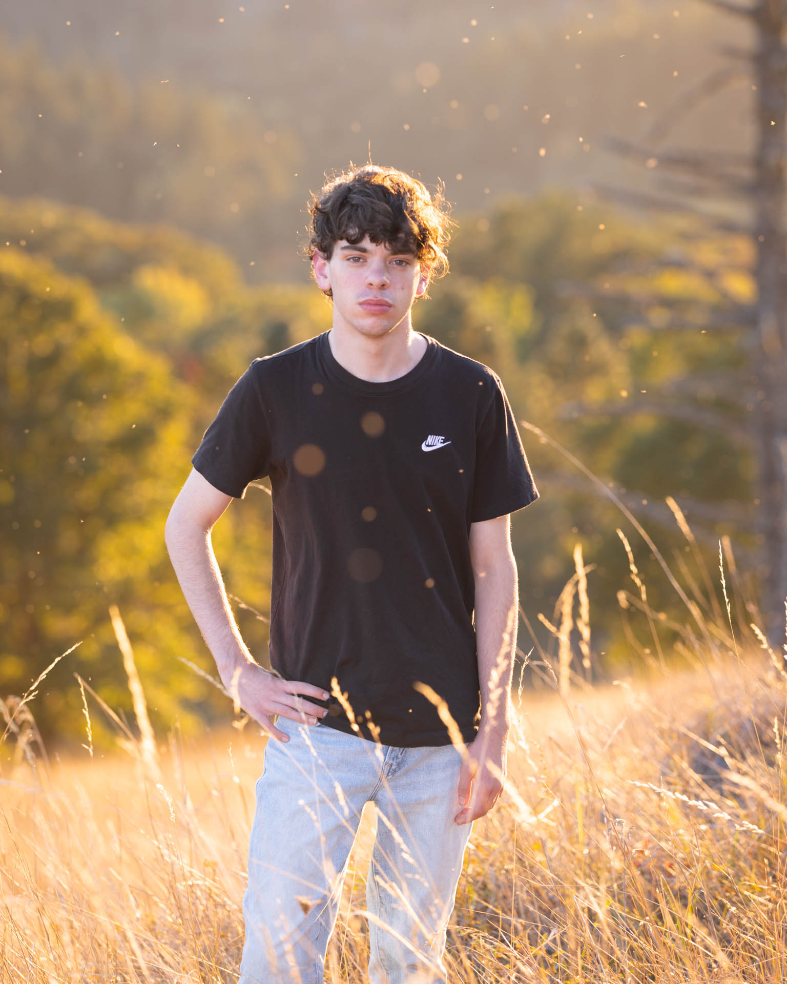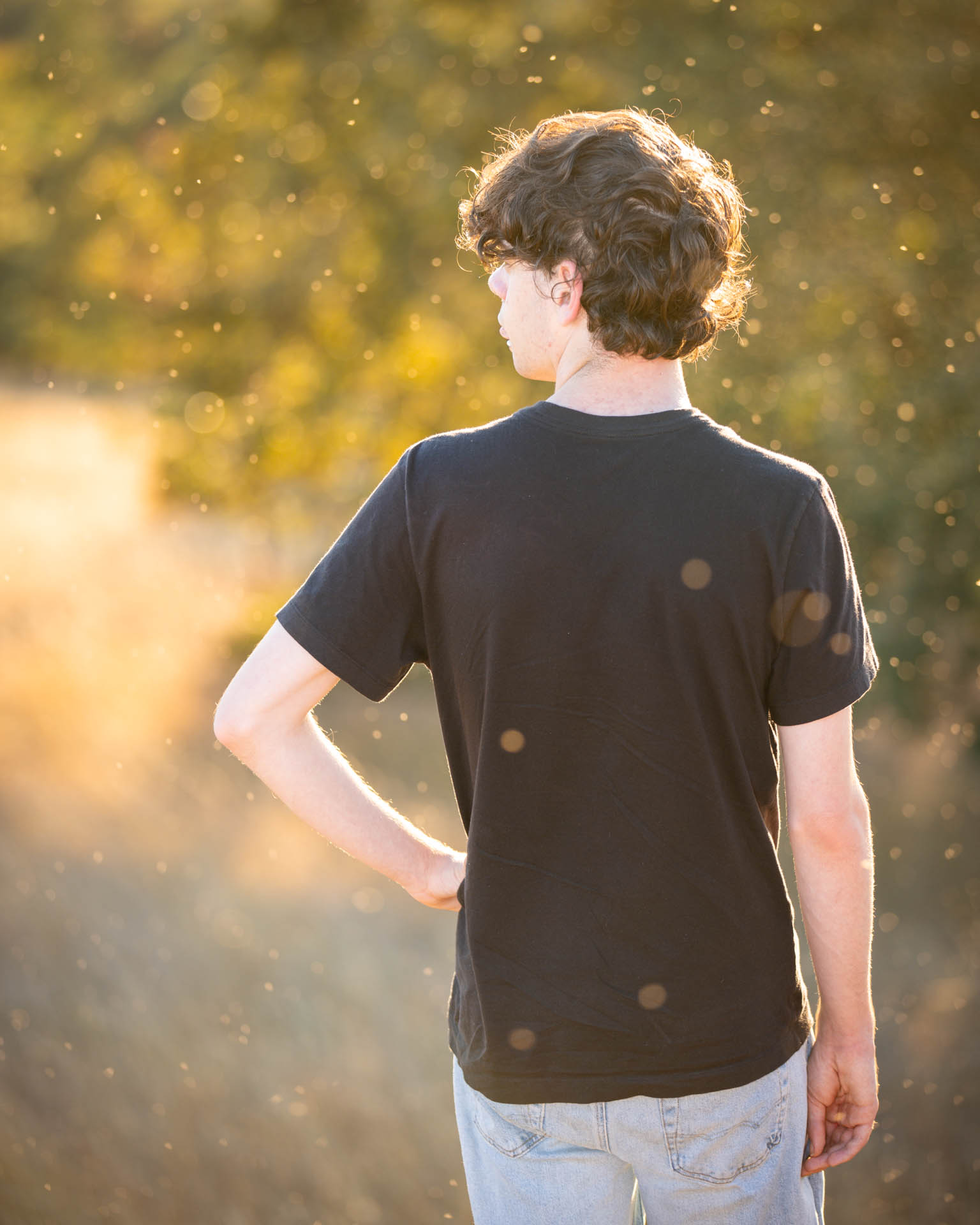 On this dreamy evening shoot, we caught golden hour perfectly. The ambiance in the air was lovely. We used the available light and fill light to exquisitely light each of these portraits for a phenomenal result. No photoshop is used here – the circular bokeh is from tiny insects buzzing in the air catching the evening glow – the professional telephoto lenses we use compress the scene and give beautiful bokeh.